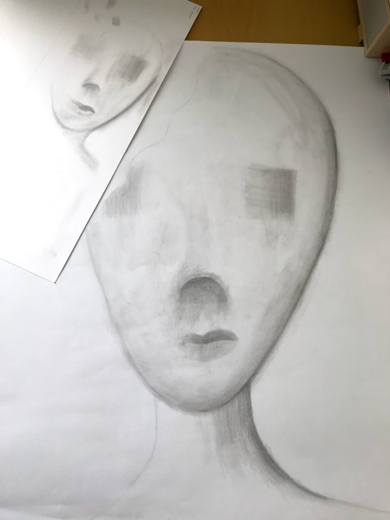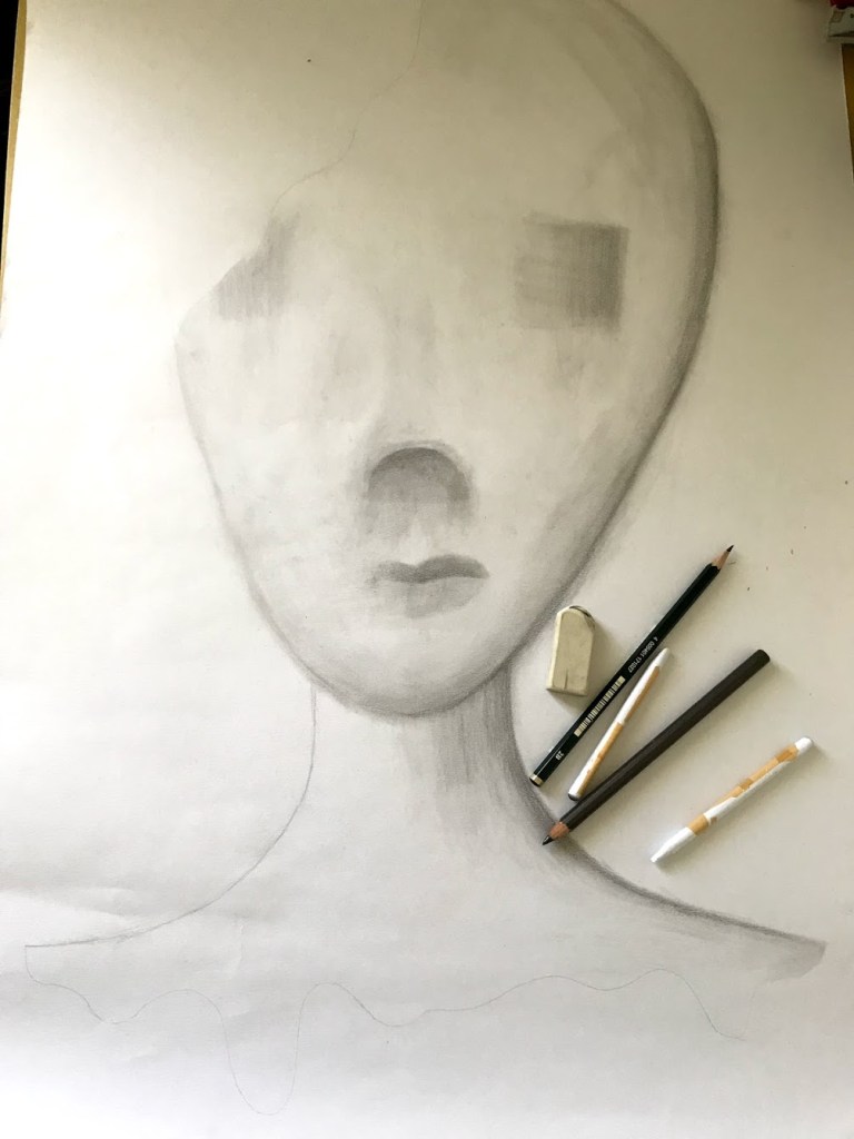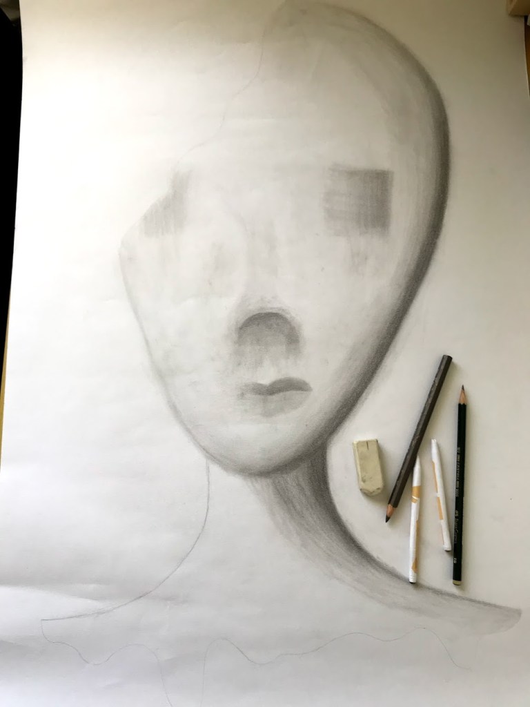 This drawing is my own impression of sleep. My idea that I was going for was an outline of an unfinished face, that shows no eyes and a melted ice cream like on the collar bones. In this drawing I also wanted to incorporate shadows (light and dark).