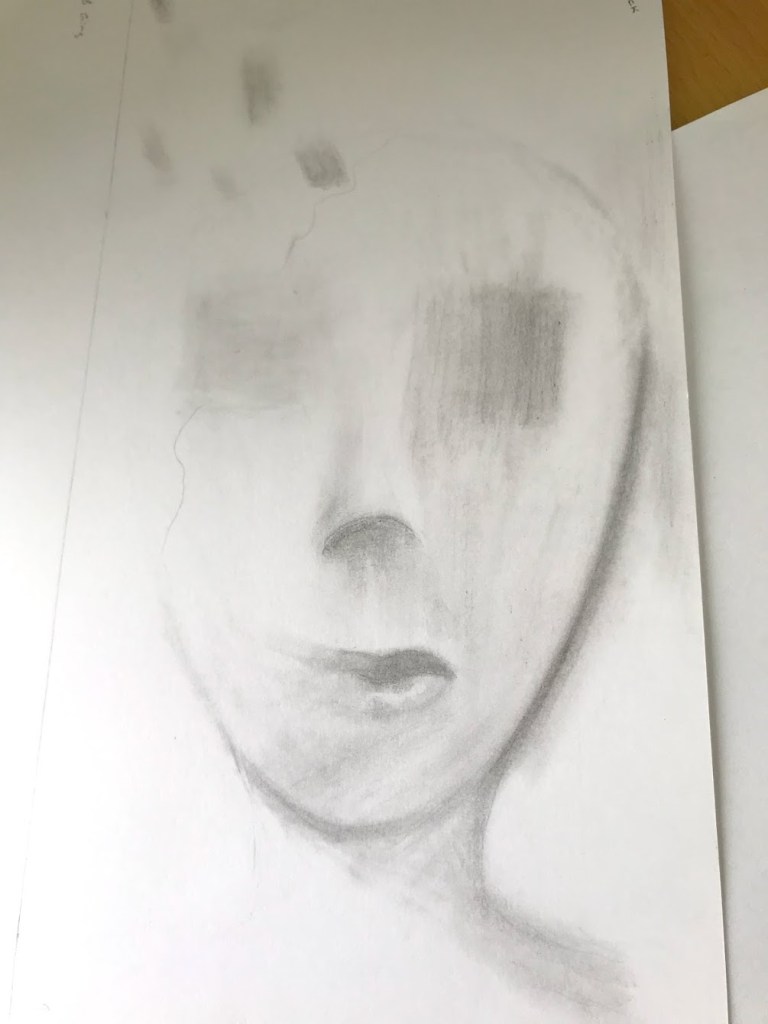 The unfinished face and the ice cream like-melted on the collar bones represents my body, unsteady and uneven this shows how I have ran out of energy for the day and need to sleep to be whole again. And the head represents my thoughts of process stops before I go to sleep as all I could think about is sleep.