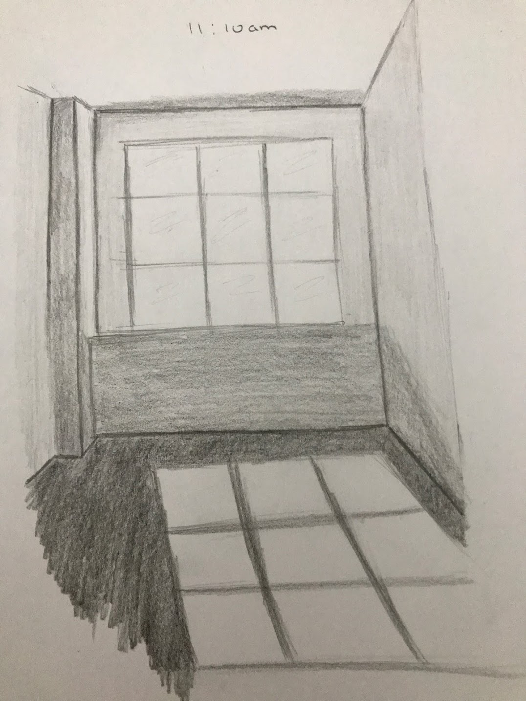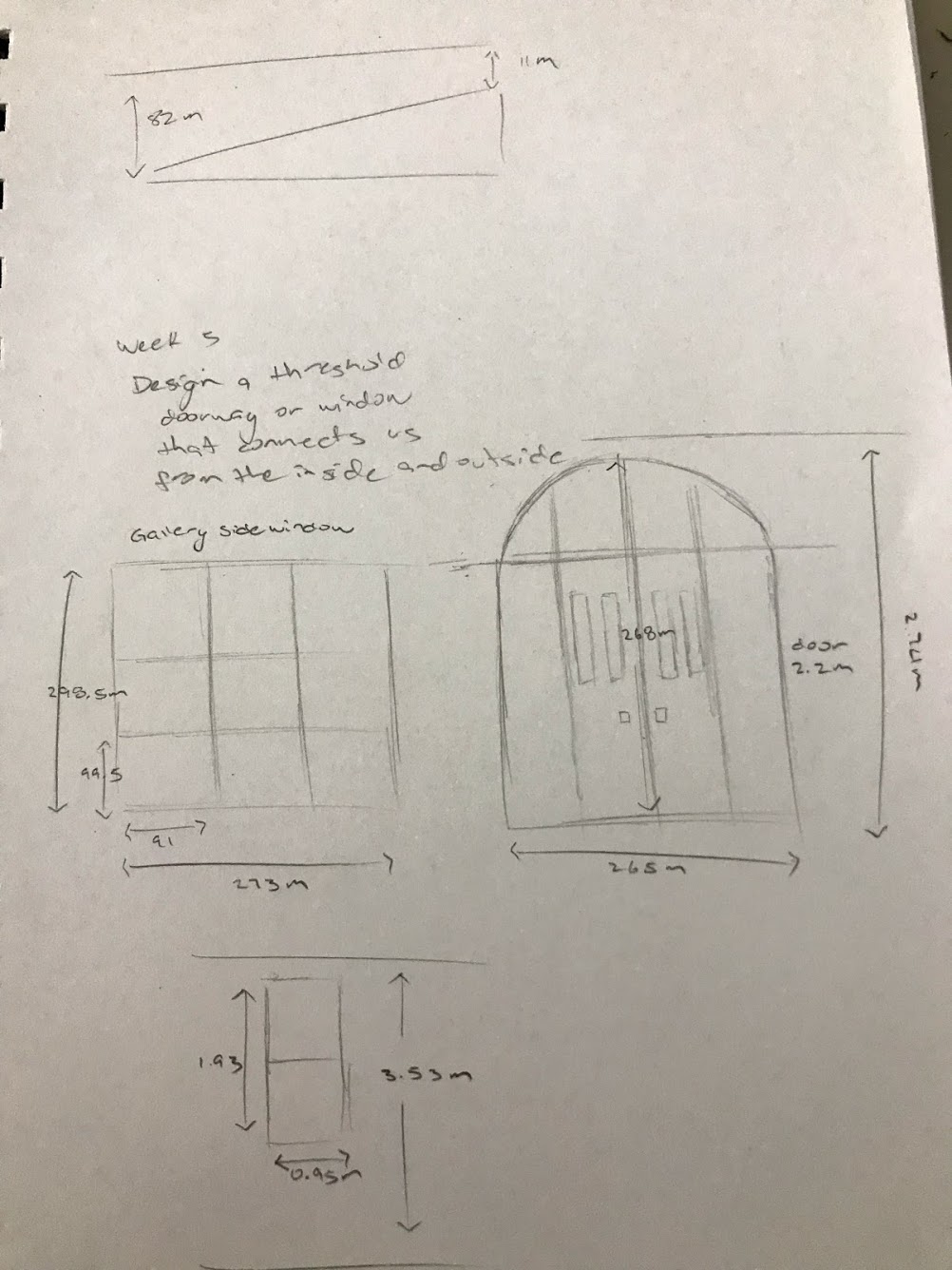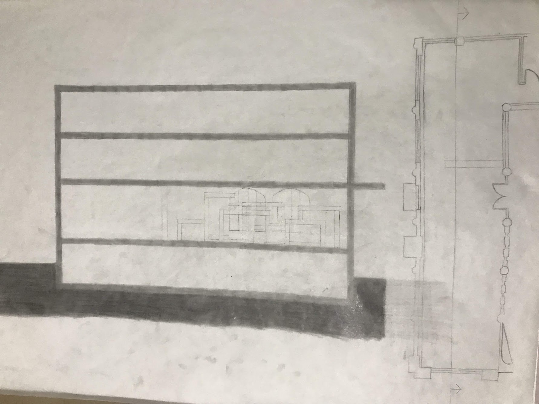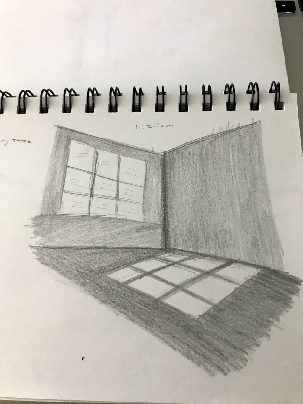 Images above shows my aerial drawing/ measurements of the gallery itself that i have taken during our visit to the gallery. The second image shows my plan of my threshold plan, where I have emphasised the sunlight filtering through the windows. The NE window have a heavy pencil to lightest pencil shade as it shows the brightest light through the window compared to the NW windows is still an interior and that room has a dim lights, which doesn’t filter as much light into the gallery hence why the light pencil shades. On the second drawing it also shows a floor plan of my threshold that i am planning to build. And thirdly the last photo shows my section drawing of the gallery and my threshold. Where it shows some sort of different level of small rooms that you can do in them. Since my project one was about fragility so I decided to add glass for the walls for my threshold idea to symbolise fragility. And since my project 1 A2 image was mainly focused on light and darkness. For this project i wanted to incorporate the material that i used for my first project which was my base hence the wood material to build my threshold idea, although this wood material is light and easily breaks i had no other wood materials that i could use so i had no other choice but to use the same material.