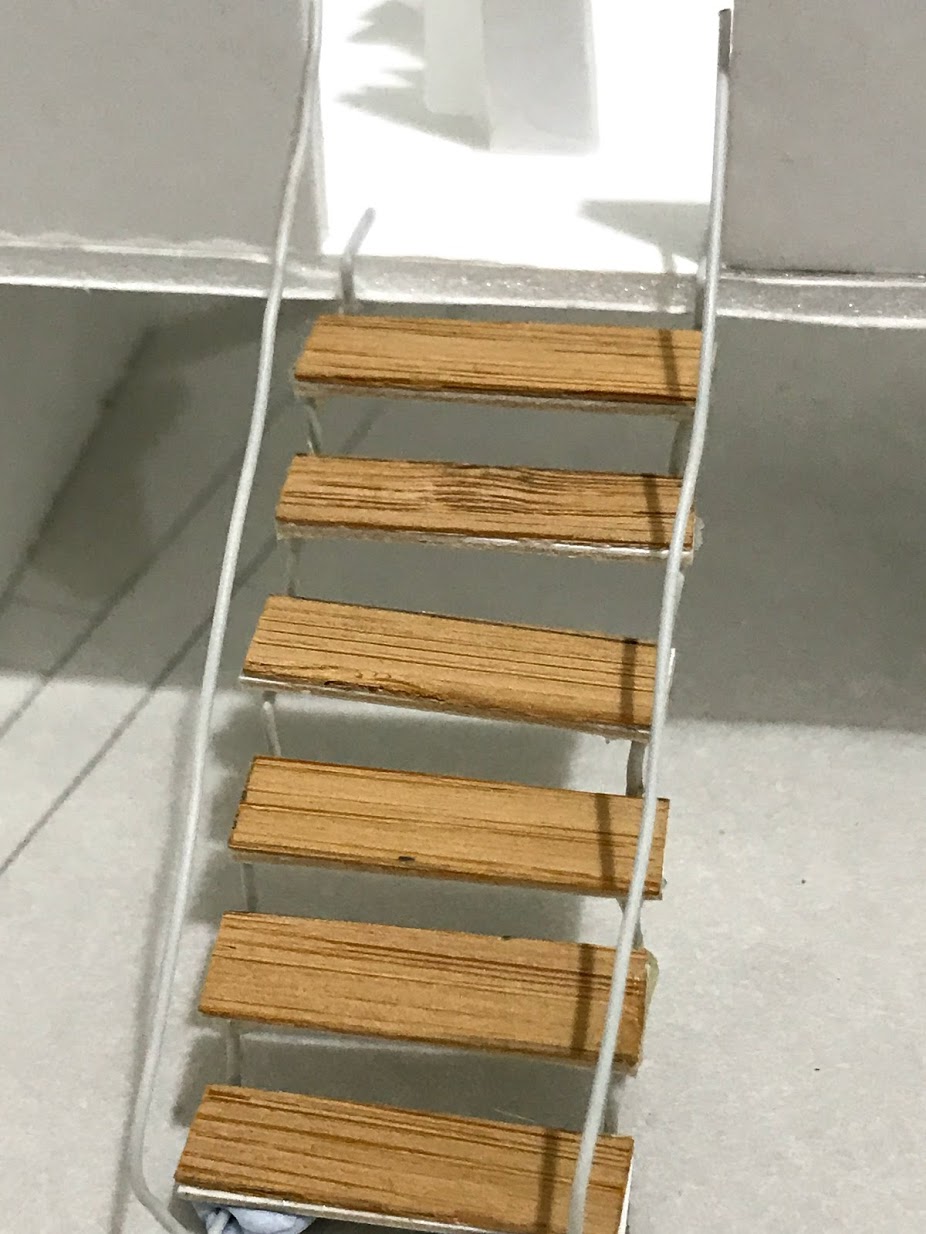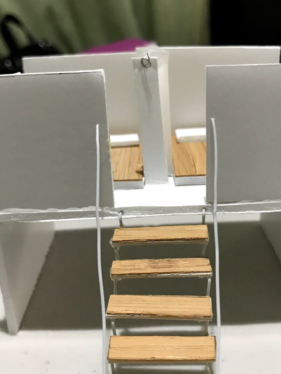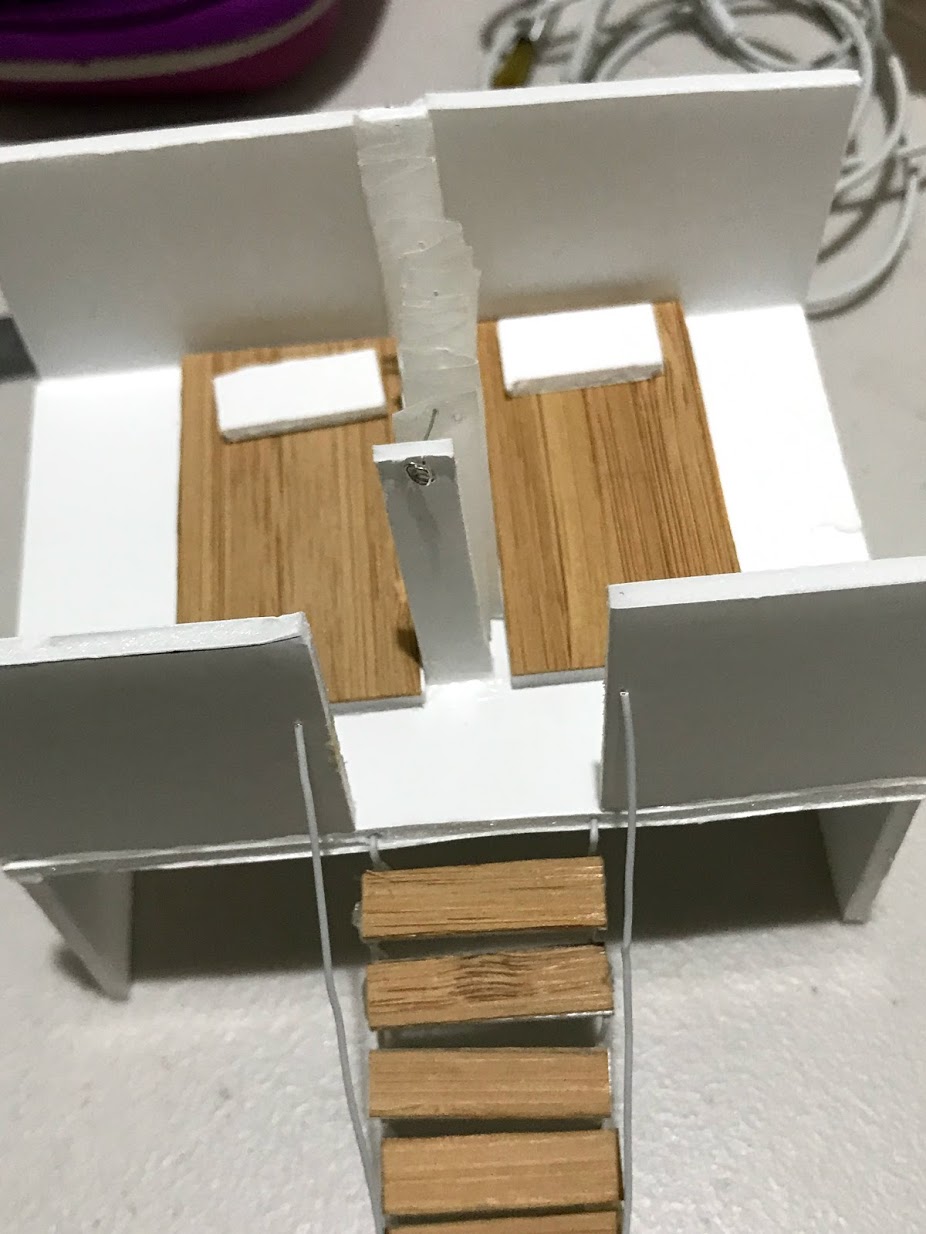To make the stairs i used a veneer, cardboad and wire. Initially i made the stairs out of foamboard stacked together in which it did not look nice for me so i ended up having to change it again.