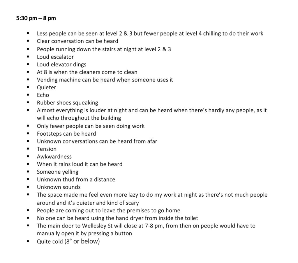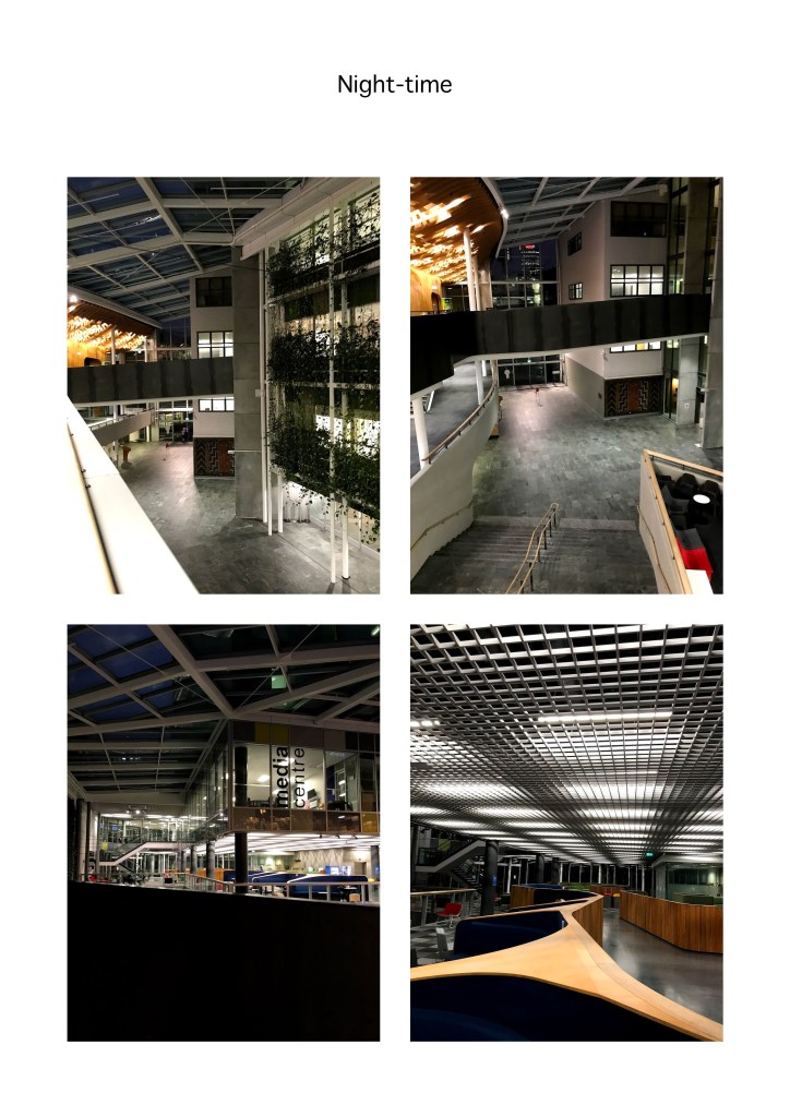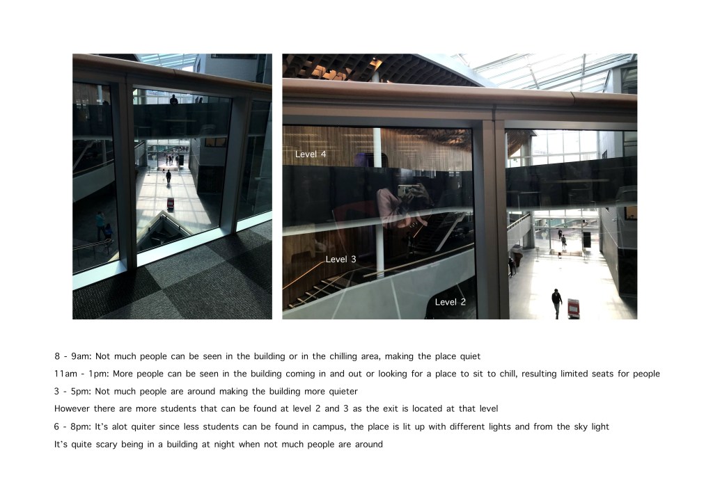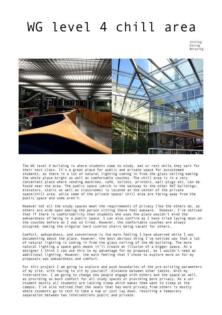 The WG building is the biggest and main building of AUT campus, where a lot of students can be seen coming in and out every second. The city is a busy and bustling place to be in, while in contrast, the WG space level 4 chill area has a threshold of peaceful, stillness for students to be able to kill time or do their work while eating and waiting for their next class. In comparison to the threshold of the city, the WG building also has so many things going on and this can be seen from the chilling area hence to the threshold being one of them is noises.