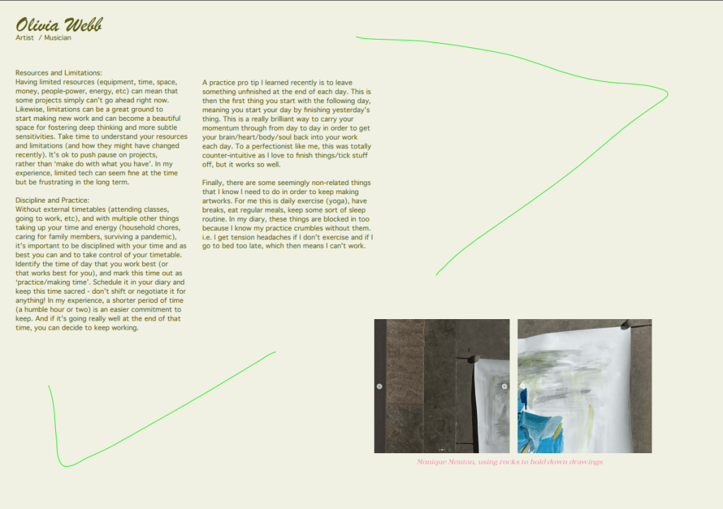 Read Working With What You’ve Got. Reflect on how your own ways of working might need to adapt to suit making at home + online learning.