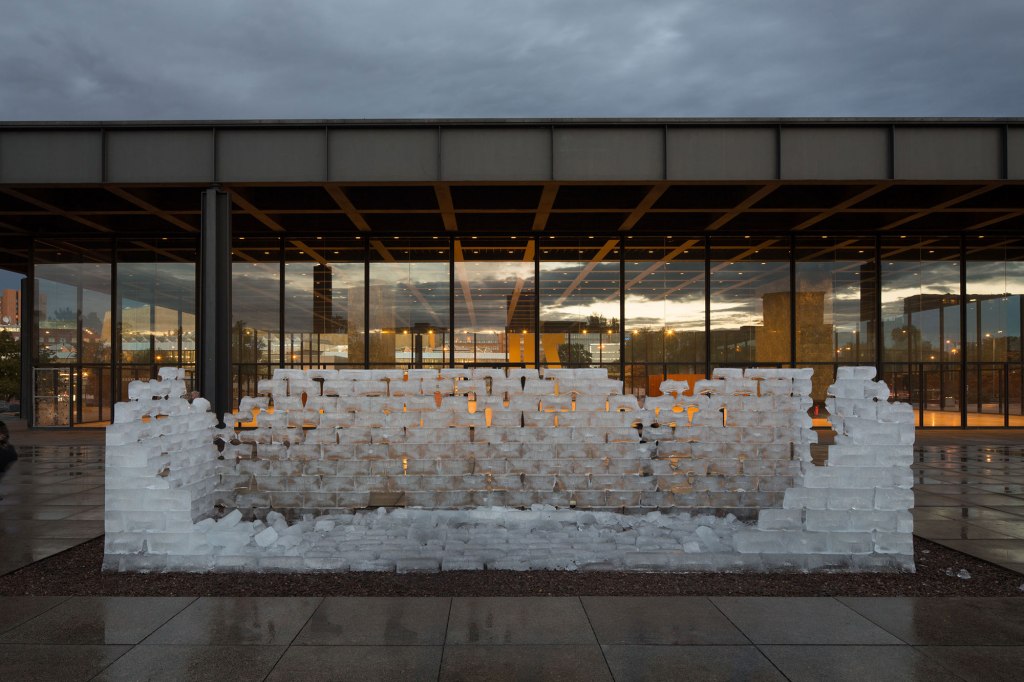 In October 1967, both the Neue Nationalgalerie, which was designed by Mies van der Rohe (and opened in the fall of 1968), and Fluids were in a state of construction. This new happening will be presented on the museum’s terrace, which is both a public and institutional space, free of charge and accessible at any time. Notably, it will take place next to Alexander Calder’s and Richard Serra’s monumental steel and iron sculptures. Unlike traditional public art, this ice structure’s sculptural form, which is reminiscent of Minimalism’s geometric aesthetics, is constantly changing, moving, melting, and vanishing.