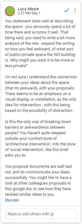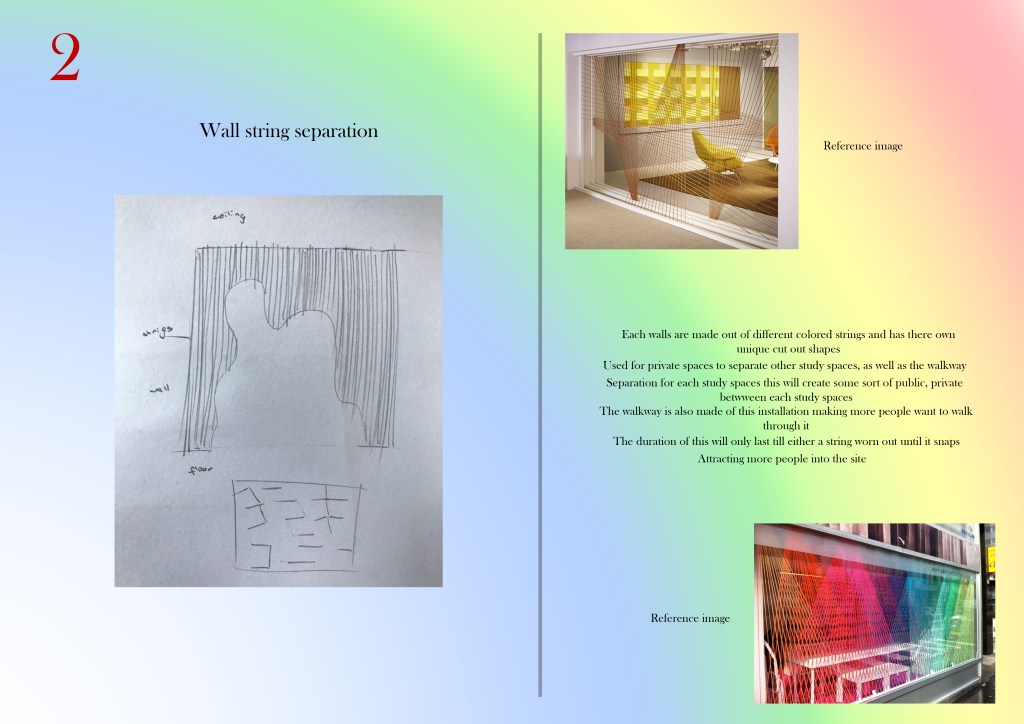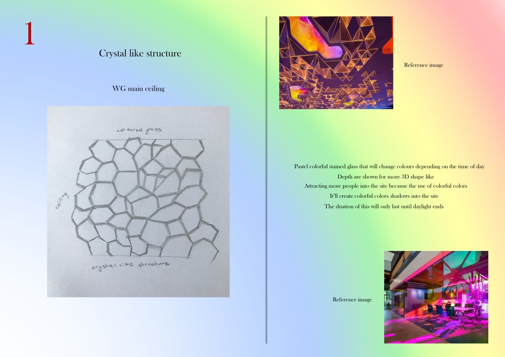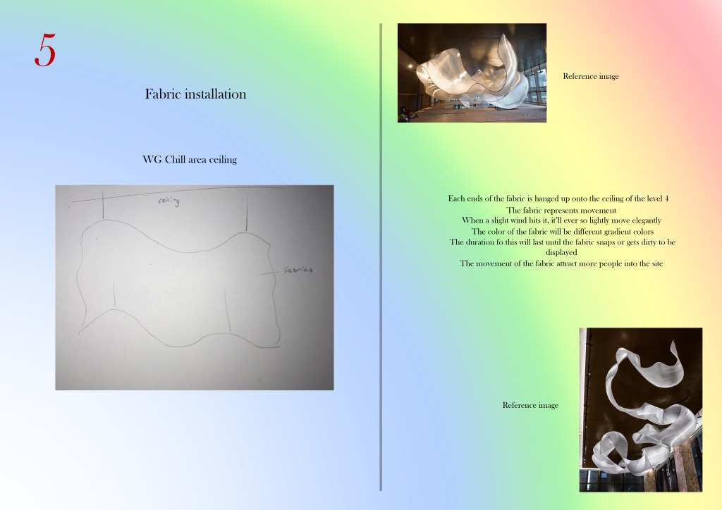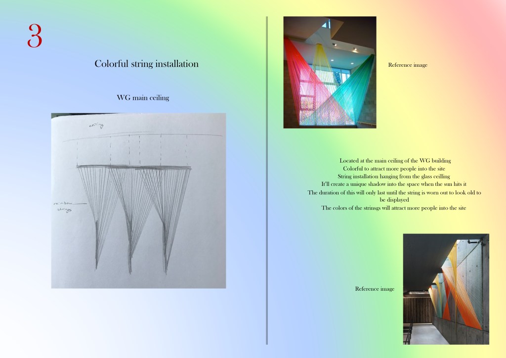 I have decided to pick proposal 1 for my final, however, with this proposal I would have to actually buy materials and put it all together then set it up onto the ceiling and i’m not quite sure if the guards or someone else might tell me to take it down as it might be a hazard to people. Furthermore I think I can make it more minimal (simple/less material) so that it won’t be a bothersome to other people.