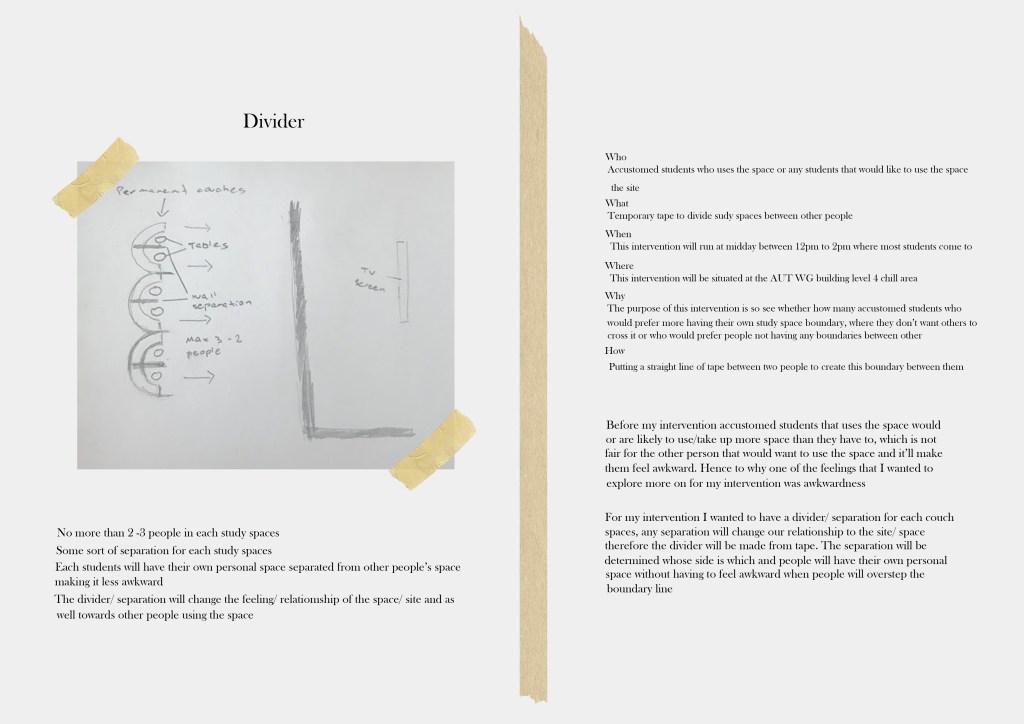 For my intervention I wanted to make create an intervention where students can have their own personal space from other students that uses the space, as sometimes when other students sits on the space/couches they would take up most of the space (like 2/3 of the space) leaving less for others to sit.