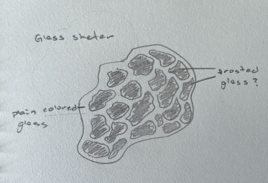 For my final design I will be using the inwards design but instead of the glass shelter being fully transparent I will be making it slightly frosted due to because to avoid direct sunlight to the eyes, as If I were to visit this site I would have wanted to look up at all the coloured glass shelter hence the reason to why I will be making it with frosted glass for people’s health and safety. Besides shelter are meant to block out the sun however in this case I want people to appreciate the sun and how it does wonders with glass and shadows.