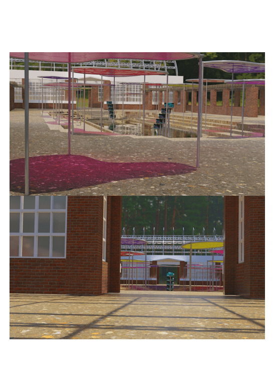 The shelter designs are my own design for the shelter using scoria as an inspiration and are extruded inwards.