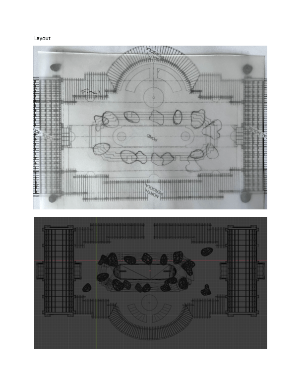 After playing around with the layouts of the shelter this is what i’ve came up with, I figured that since the two glasshouses are smmytrical as well the pond i figured that the shape and sizes of the glass shelters should vary, i got this idea of overlapping and different sizes from the lilypads.